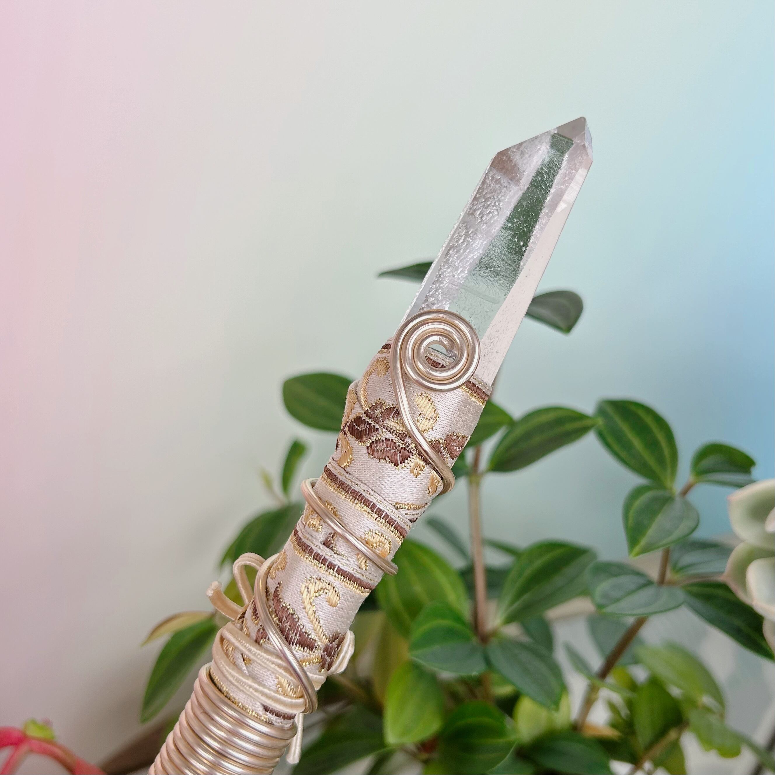 魔法の力を秘めたこのワンドの特徴は、透明度が高くボリューム感のあるクリスタルとゴールドの織リボンにあります。