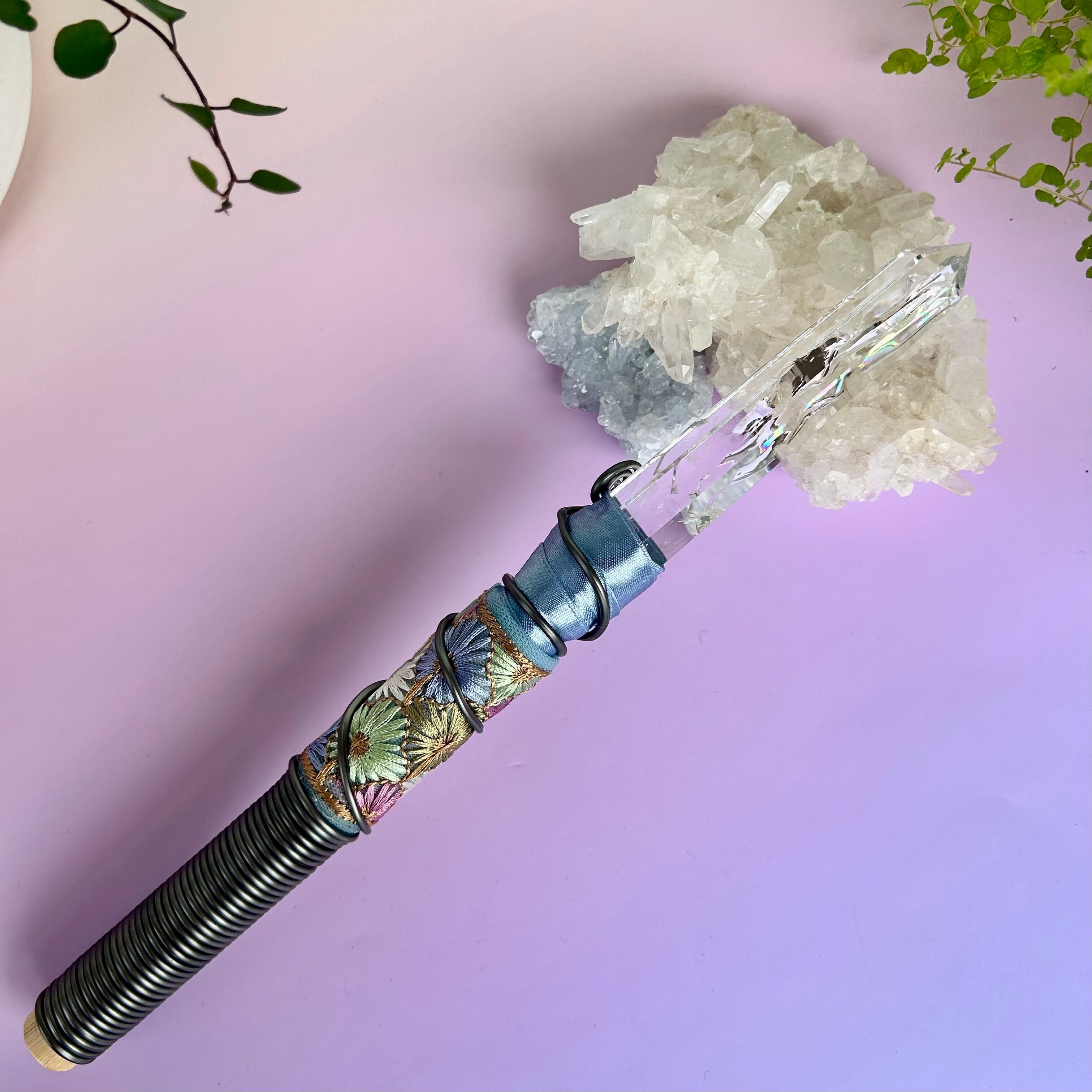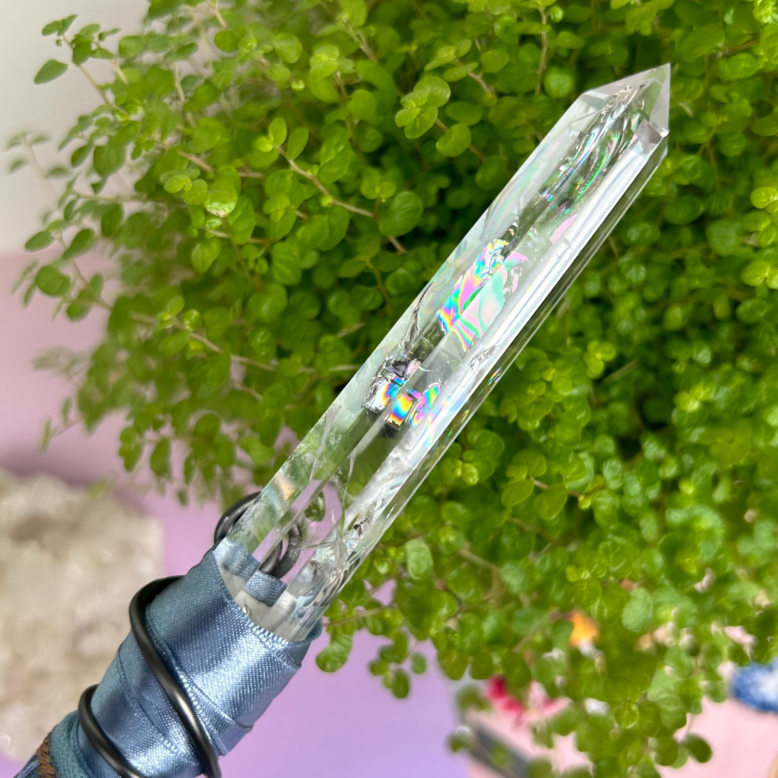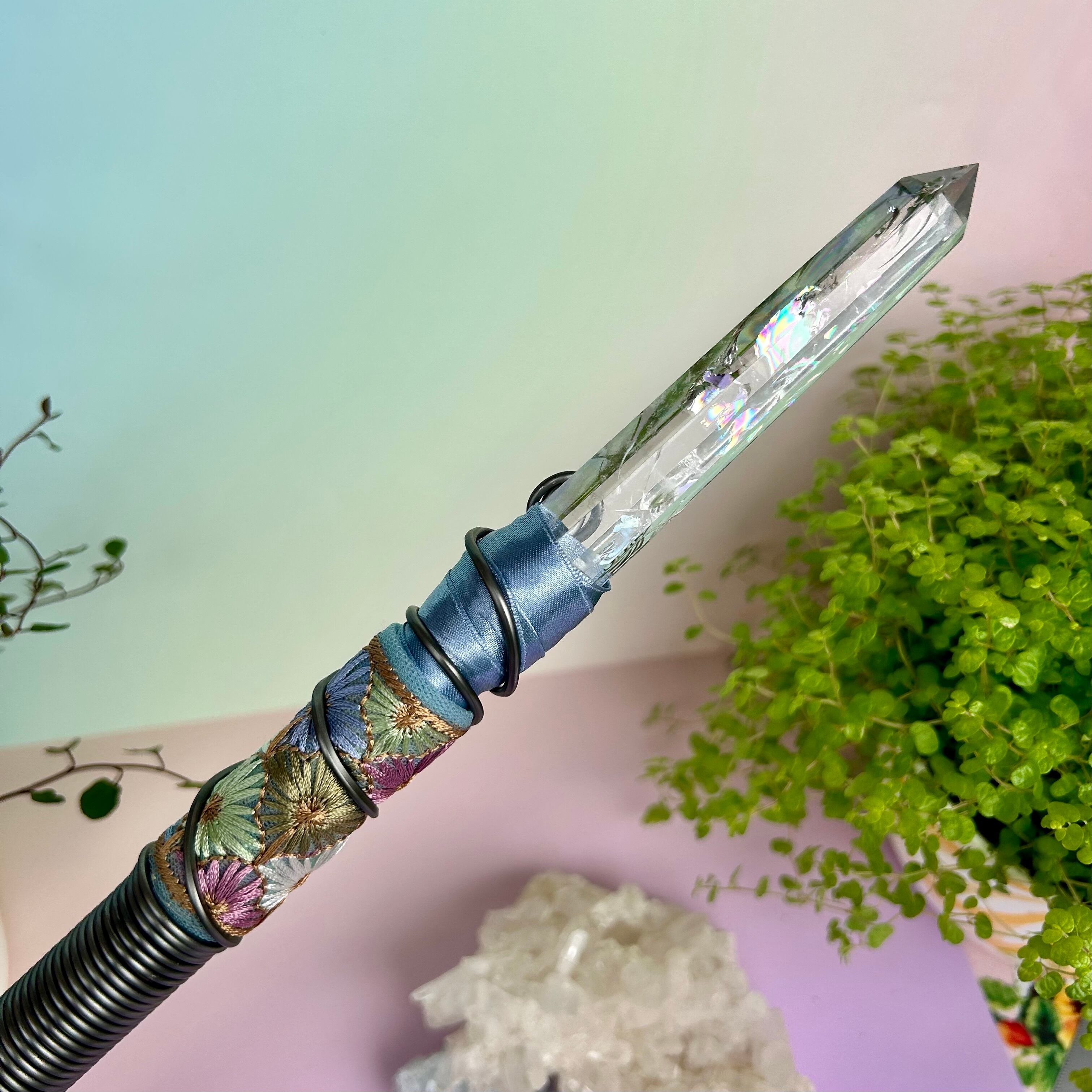 魔法の力を秘めたこのワンドの特徴は、この特別で美しい虹水晶にあります。一言で言えば《最上級》の虹水晶(アイリスクォーツ)で、私の秘蔵のコレクションの一つです。光にかざすと大きな虹が次々と生まれては形を変え・・・まるでホログラムのようです。