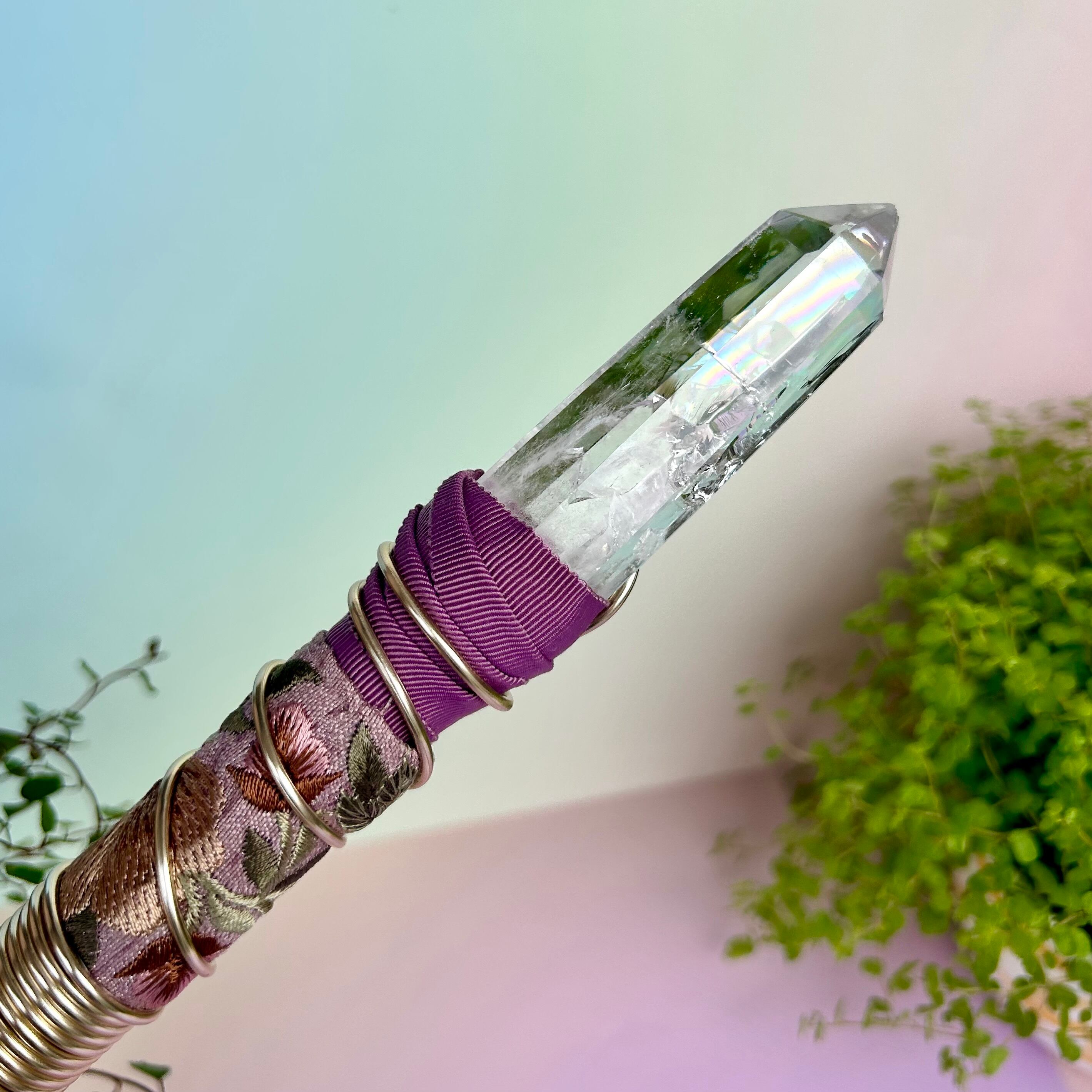 サイズも大き目でずっしりとした手ごたえがあり、存在感とそのエネルギーの強さはまさに女王様クラスです。その超パワフルなクリスタルに、あえてエレガントなモーブカラーと同色のインド刺繍のドレスを合わせて《強くて美しい》ワンドに仕上げました。